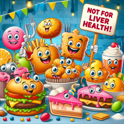 설탕이 많이 들어간 음식은 혈당을 급격히 올려 간에 부담을 줄 수 있어요. 케이크, 사탕, 탄산음료 등은 주의해야 해요.